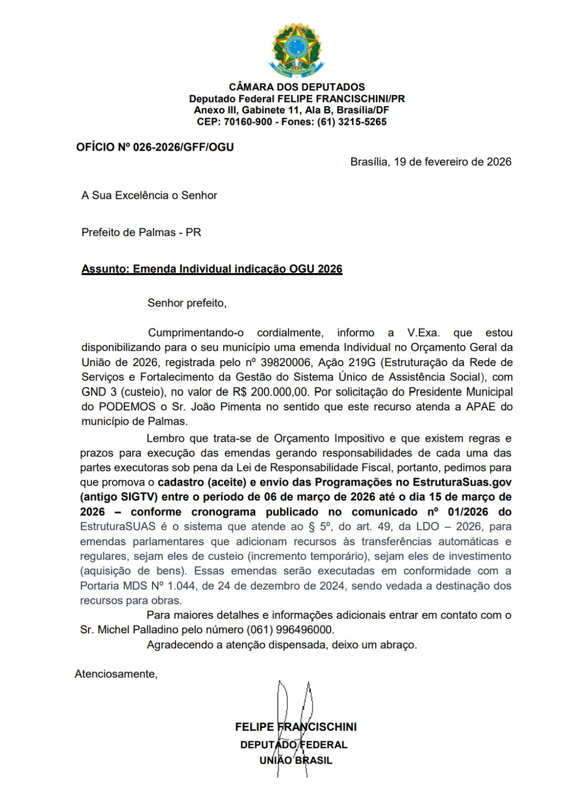 O Gabinete do Deputado Federal Felipe Francischini encaminhou, dia 19 de fevereiro, ofício para a Prefeitura de Palmas, informando de emenda individual no valor de R$ 200 mil. Após esforços conjuntos da presidente estadual do Podemos, Luciane Bonatto e do presidente do Podemos Palmas, João Pimenta, documento informa ao prefeito que trata-se de emenda Individual no Orçamento Geral da União de 2026.