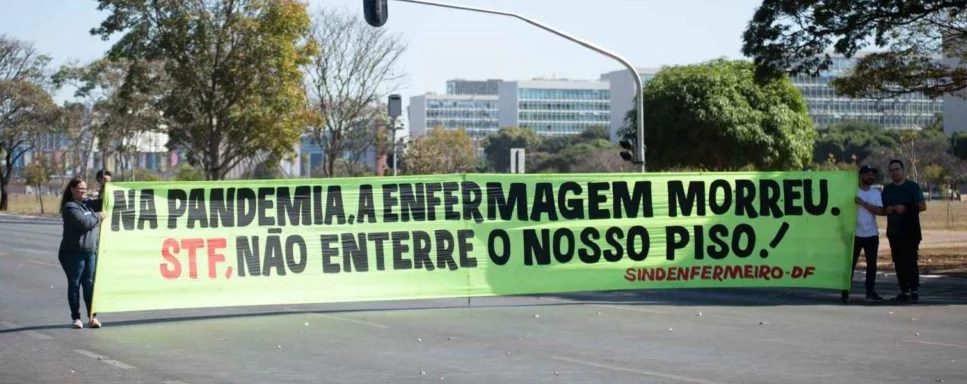 Neste domingo, dia 3 de julho de 2023, profissionais da enfermagem realizaram um protesto na Esplanada dos Ministérios, em Brasília, contra o resultado da votação do piso da categoria, concluída pelo Supremo Tribunal Federal (STF) na semana anterior. Durante o ato, a Polícia Militar do Distrito Federal (PMDF) utilizou spray de pimenta para conter a manifestação.