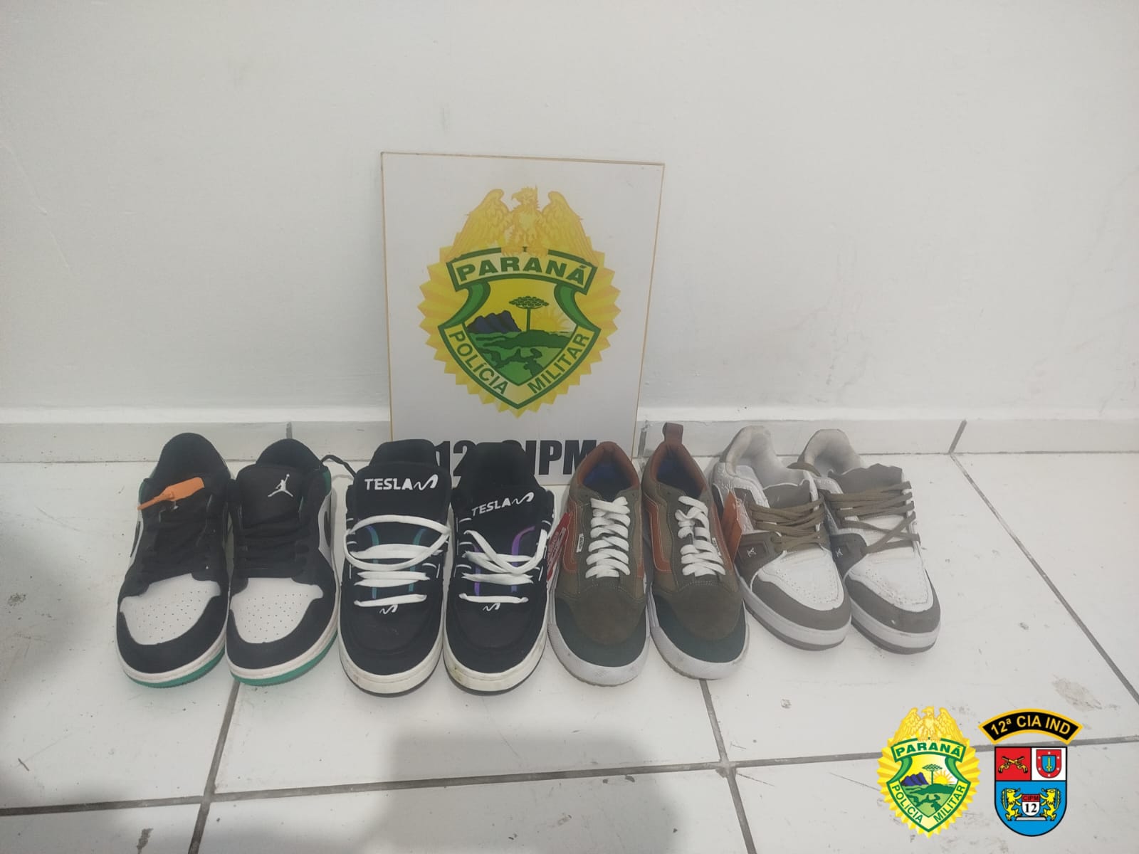 Entre os itens recuperados, estavam quatro pares de tênis, os quais foram entregues à autoridade policial, juntamente com os menores apreendidos, para a realização dos procedimentos cabíveis.