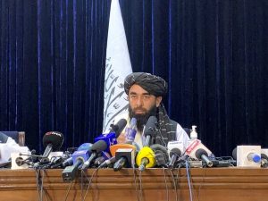 Zabihullah Mujahid, porta-voz do Talibã, durante a primeira entrevista coletiva oficial do grupo depois de tomar o poder no Afeganistão, em 17 de agosto de 2021 — Foto: Rahmat Gul/AP