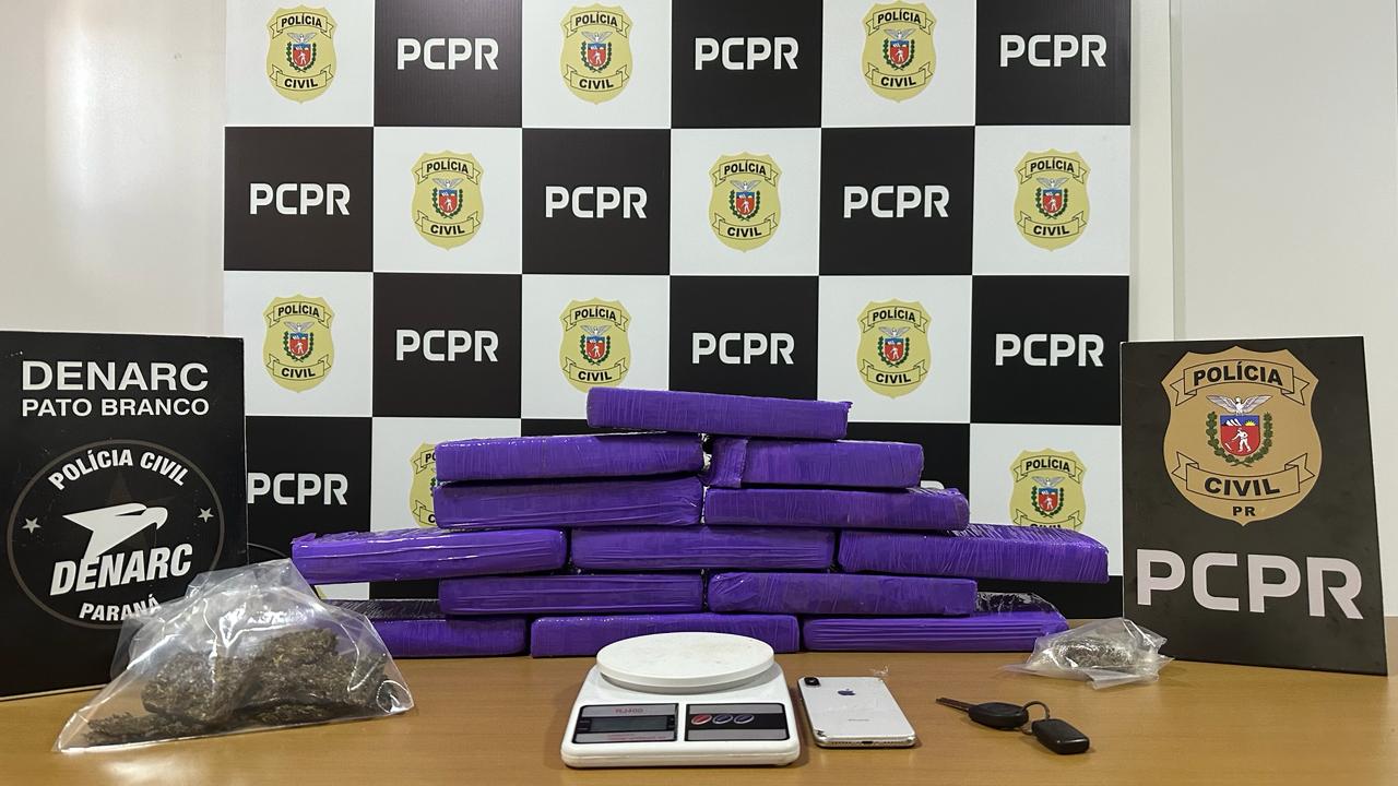 A Polícia Civil do Paraná (PCPR), através da DENARC – Núcleo de Pato Branco e 5ª Subdivisão Policial de Pato Branco, prendeu em flagrante, nesta tarde (por volta de 13h00) um homem de 22 anos, flagrado na posse de quase onze quilos de substância análoga a maconha (10,925 Kg).